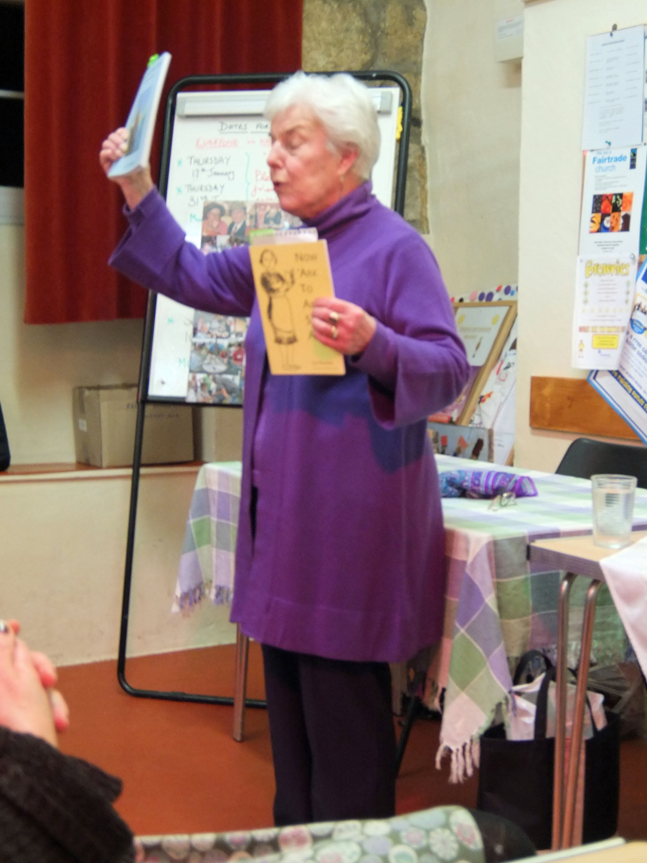 Once we’d had our fill of trifle, cheesecake and treacle tart, we were treated to some Cornish stories and poems by the delightful Liz Harman. Liz read from her book Now ‘Ark to Me and regaled us with her hilarious version of a W.I. committee meeting, as well as tales of Aunt Sarah Jane trying to buy a blue bag in Penzance.
