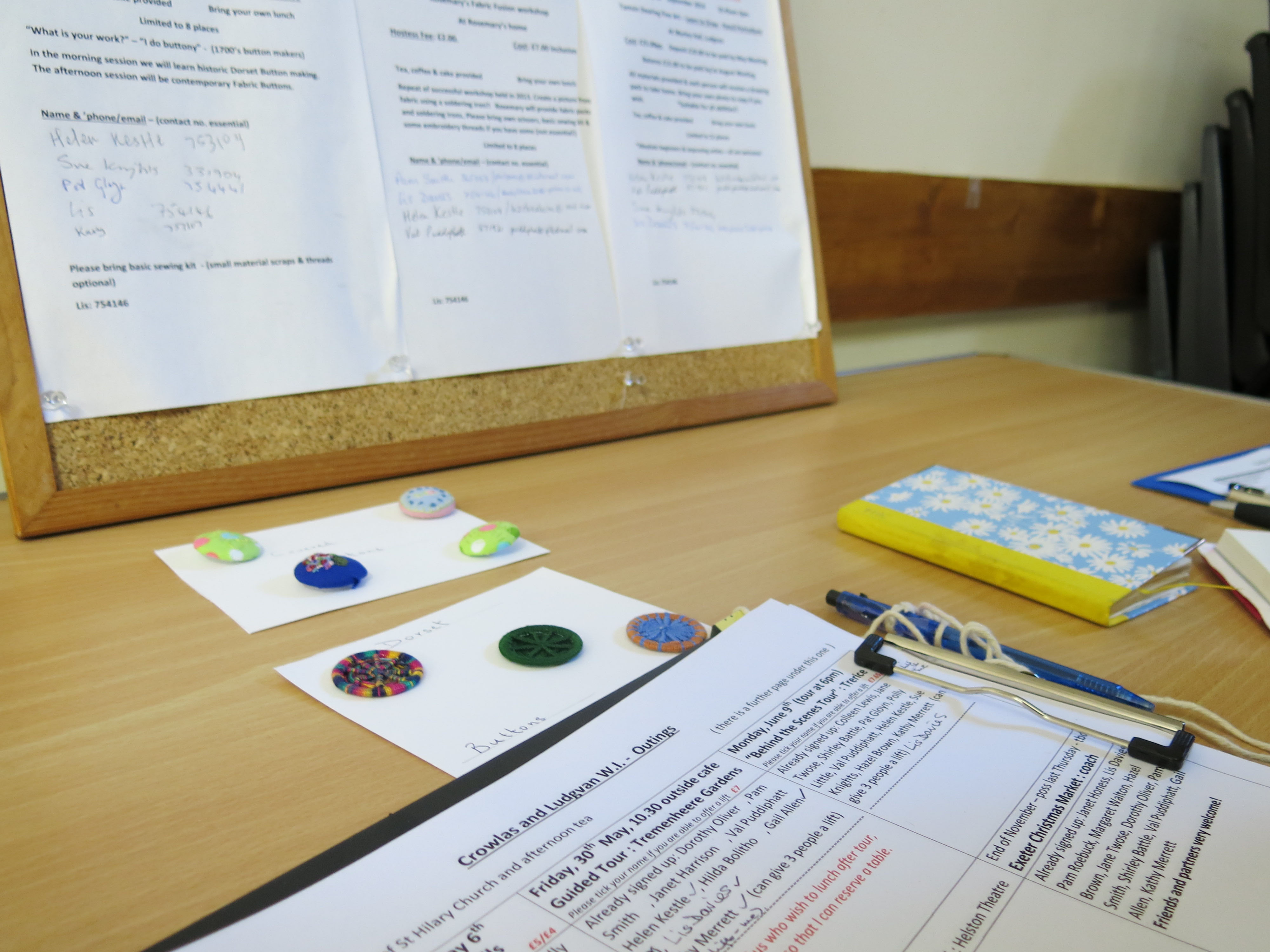 We’ve now created a one-stop table for you to sign up for all of our events, outings and craft days, as well as for all CFWI events. This was a really busy spot last night! In addition, on the table were samples on display of the lovely buttons we’ll be making at this Friday’s button workshop, and some samples of our Rag Dolls’ fabulous rag rugging work.