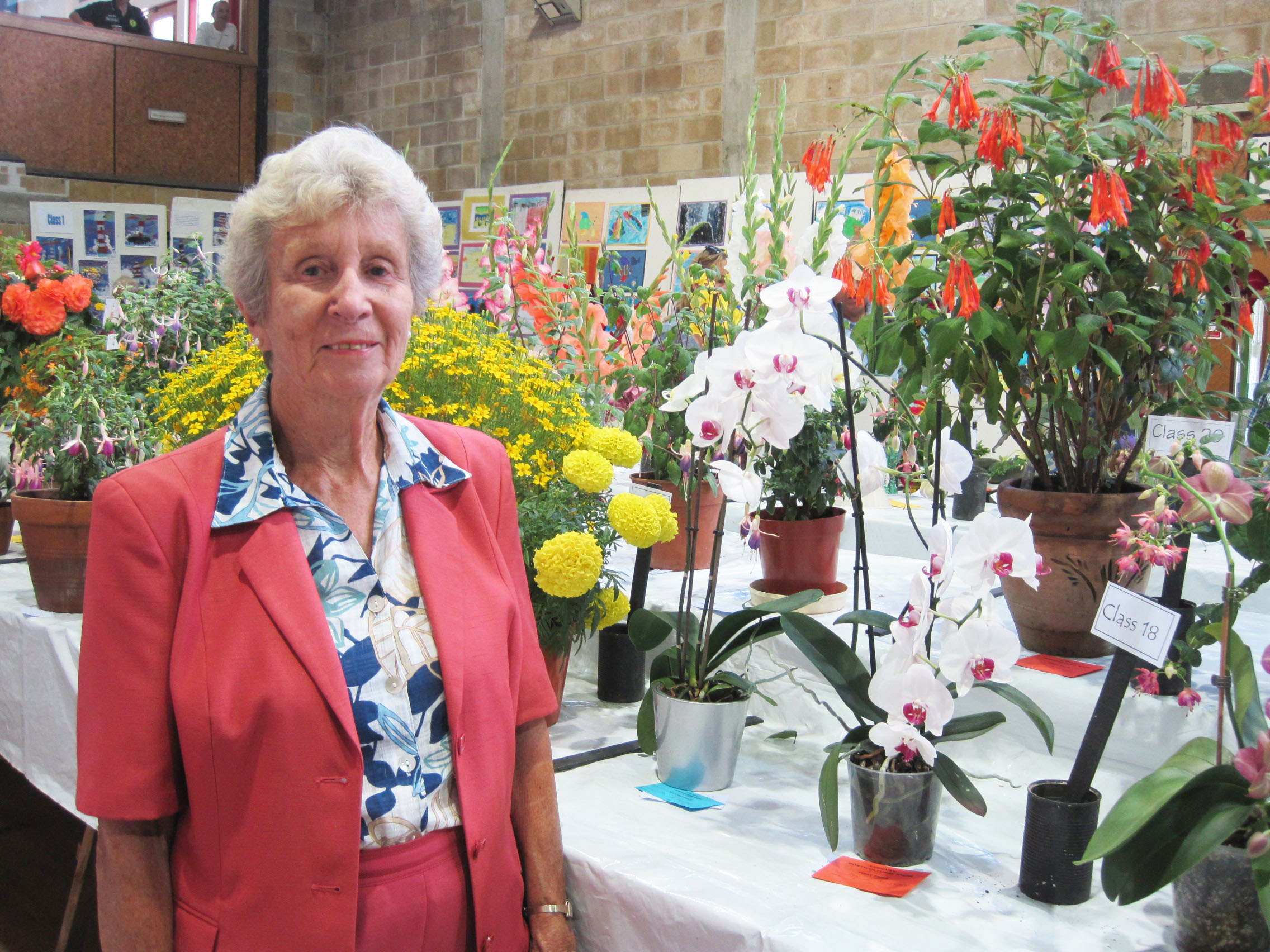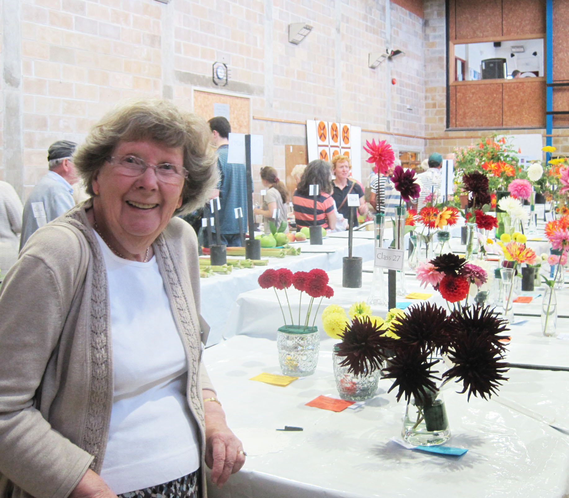 Richard Sargeant presented the cups and other trophies at the end. Hilda Bolitho,Vice President of the Horticultural Society, is shown with the whole show in the background and the lovely vase of blooms are an exhibit from her garden.