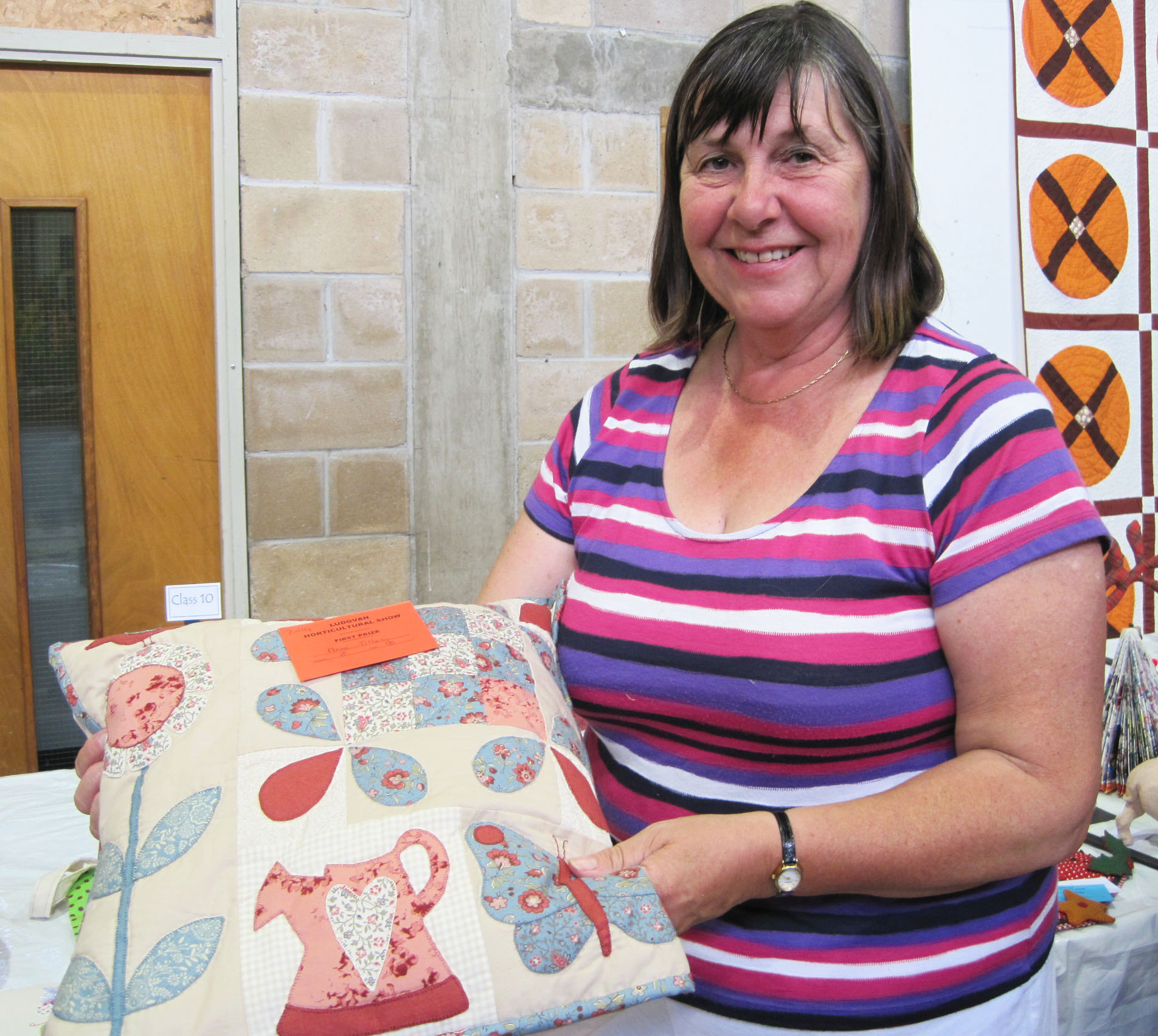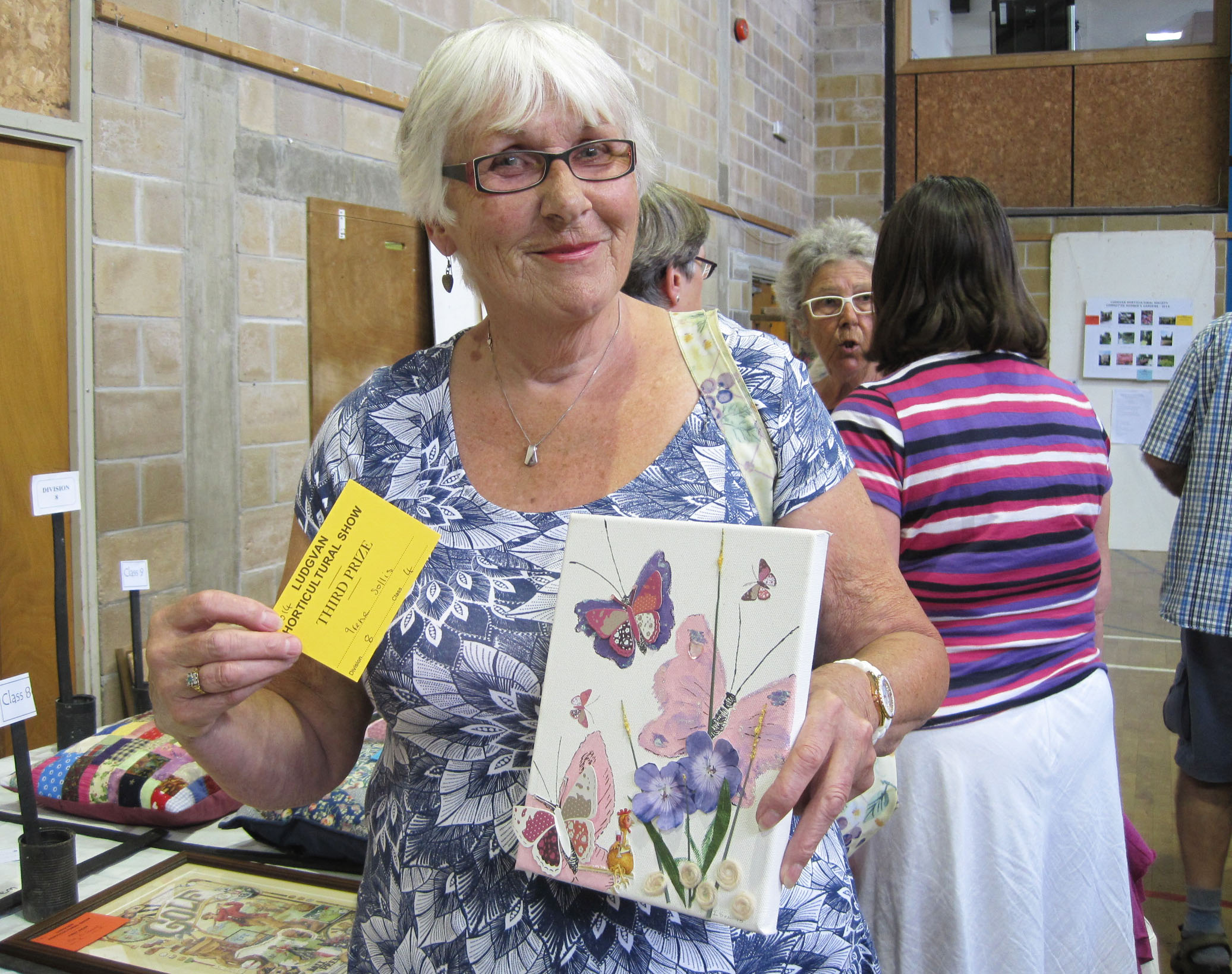 Here are photos of some of our wonderful winners from the Show with a selection of their prize-winning plants and blooms, home produce and art: such a talented lot we are at Crowlas & Ludgvan WI! Gill Gowland with her scrummy lemon drizzle cake, Anne Tilley with her delicious Victoria sandwich cake and her gorgeous cushion, Sue Knights with her great fun and clever rag rug cushion, Irene Sollis with her delightful butterflies, Val Thomas with her delicate mop head hydrangeas, Dianna Kelynack with her perfect orchid, and Rona Cowls with her luscious blueberries. Rona went on to win the Crowlas and Ludgvan WI cup for the WI member with most points overall.