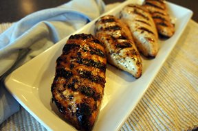 - When you’re ready to barbecue, drain the chicken and dispose of the marinade. Put the chicken on the barbecue and cook for about 5-6 minutes per side, until it’s nicely striped with grill marks and is no longer translucent.