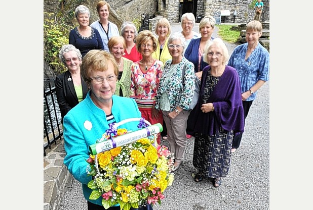 Glamorgan County Chairman Carolyn Davies  holds the commemorative Baton with members of  Neath WI at Aberdulais Falls.