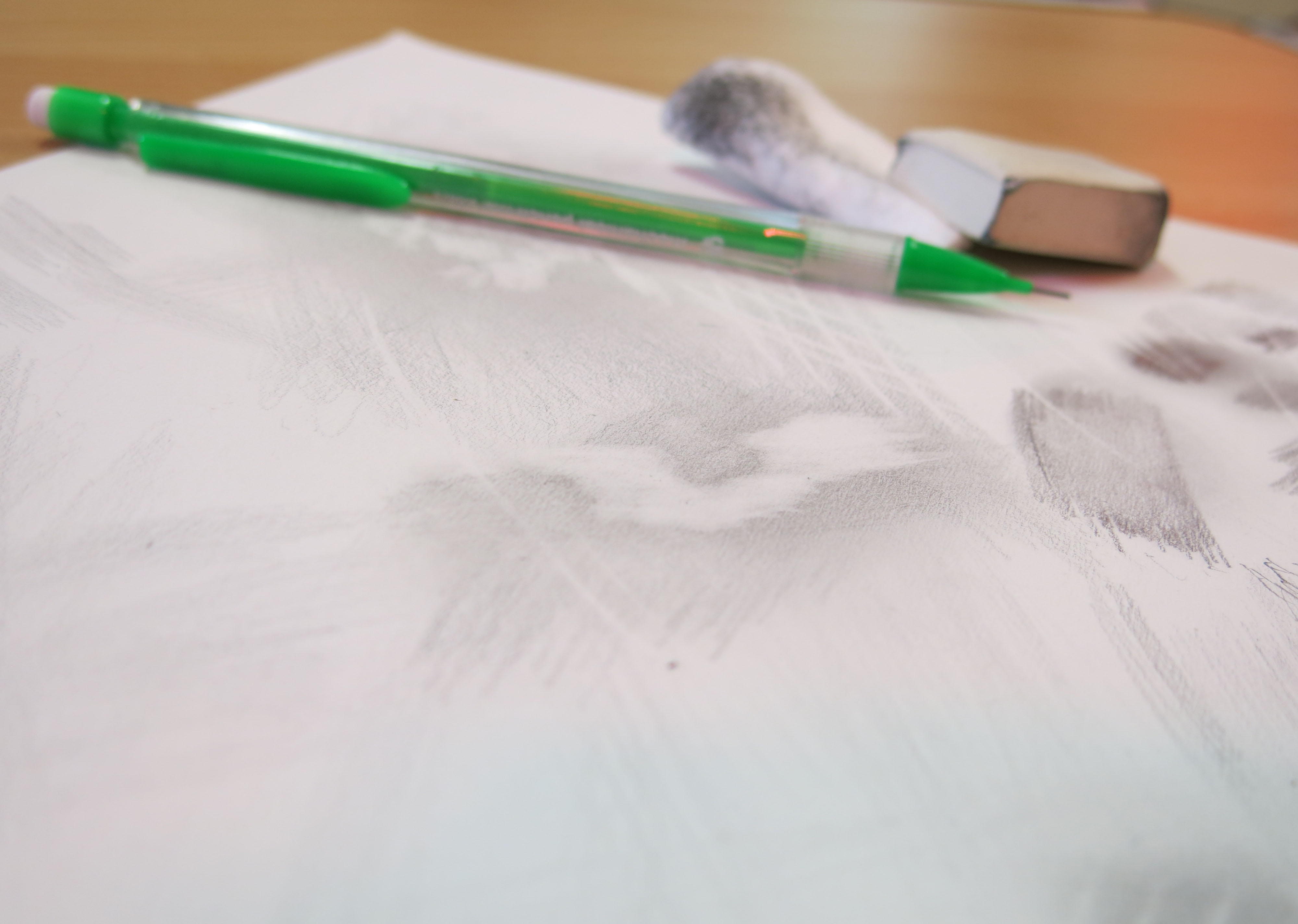 We started by learning some shading techniques using mechanical pencils, as well as how to use a rubber and other tools of the trade to create different effects.