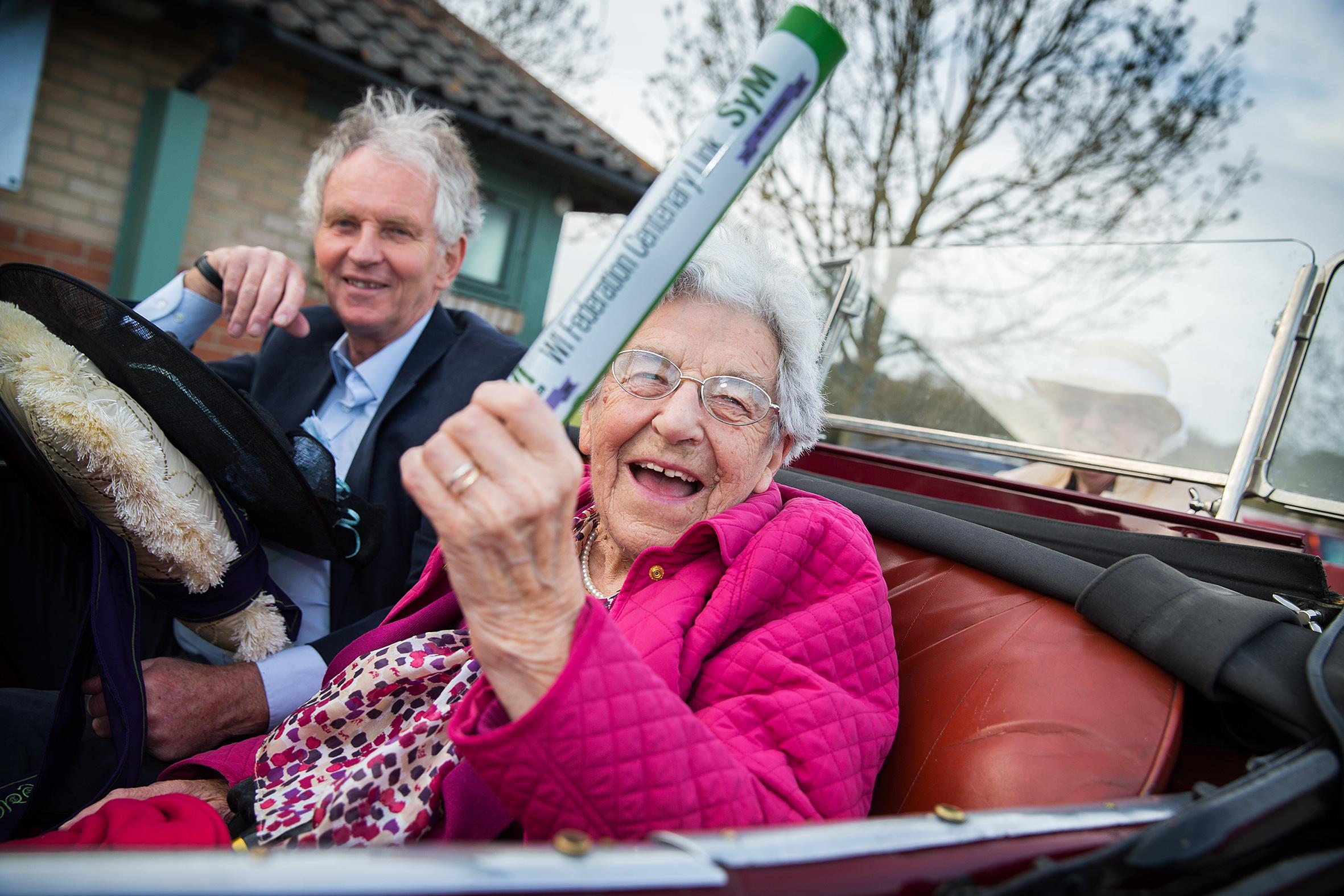Lulu Belcher, he oldest member of the Fritillary group, took the baton in a 1926 Bullnose Morris from Denman to her group’s venue in Horspath, where it was met by a fanfare of buglers.