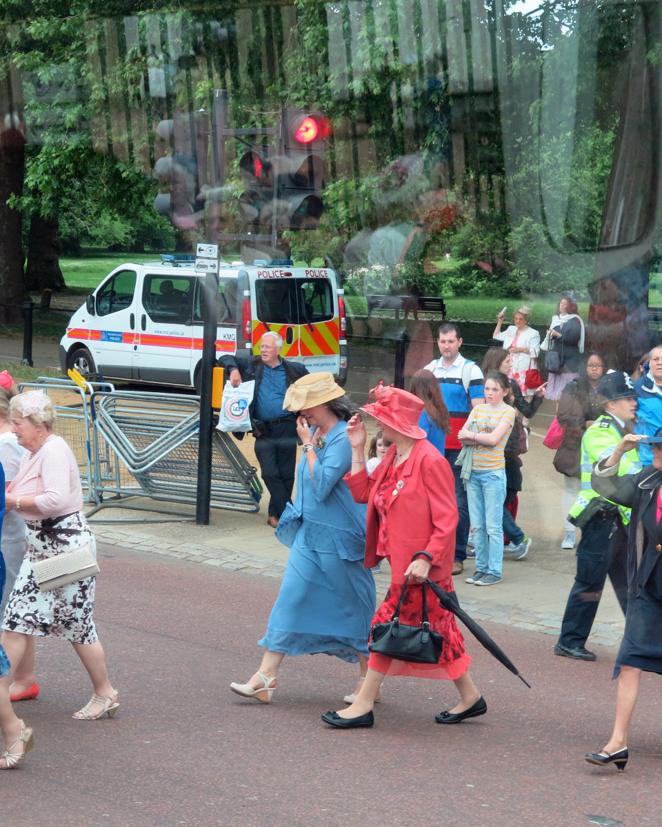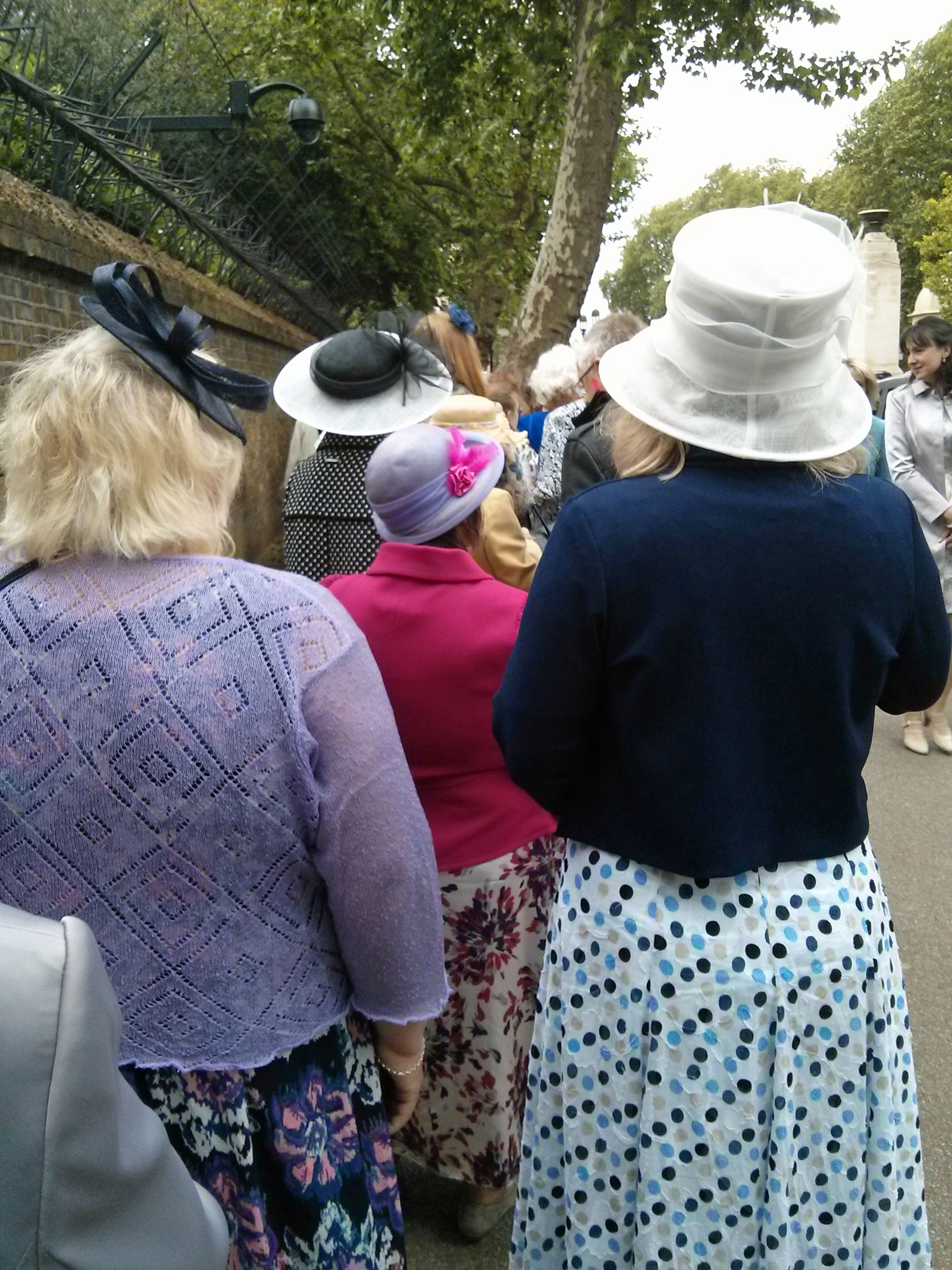 We left our end of Cornwall at the shocking hour of 5am, picking up excited ladies as we headed north. The atmosphere grew more and more festive the closer we got to London, particularly after our last comfort stop when we all changed out of our comfy clothes and into our garden party finery!