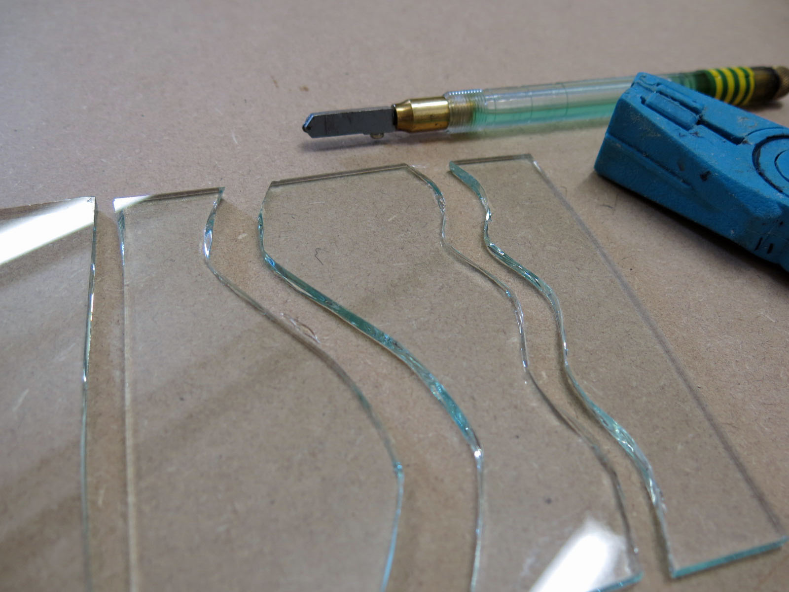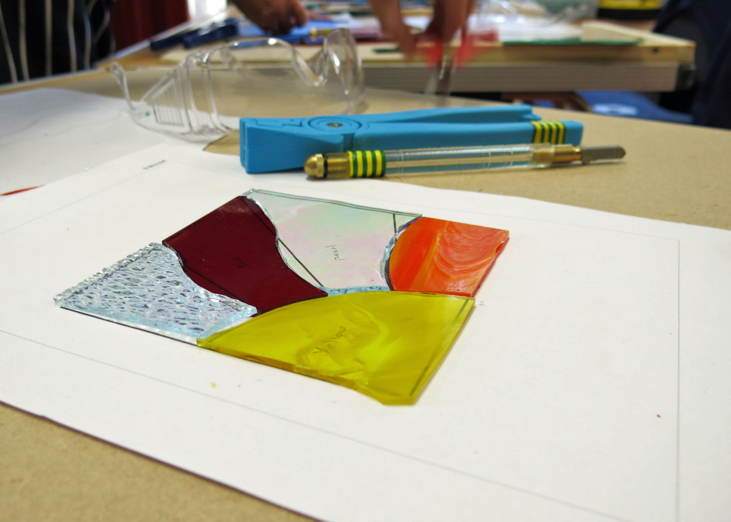 Claire had us practice cutting on plain glass first, using a special cutting tool and snippers. We made straight cuts, then curved cuts and then tried to cut following a stencil.