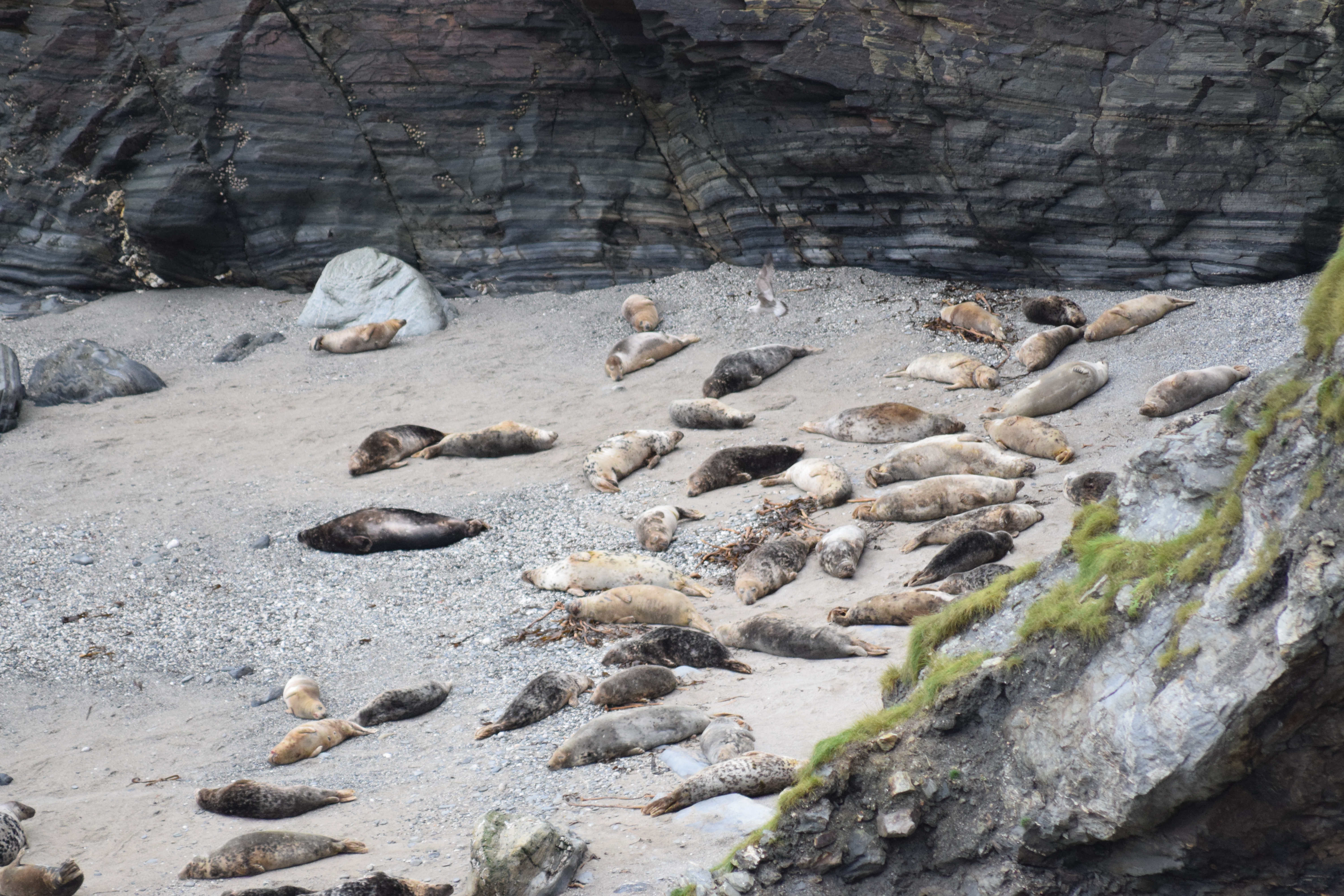 We had a gentle amble from the carpark at Godrevy along the path towards the island, and north up the small incline to the barriers. Kathy had suggested we visit the seals. I wasn’t really expecting to see any but what a sight to behold. 100 plus seals and pups lying on the beach below. I have never seen anything like it and would recommend it to everyone. (Gail)