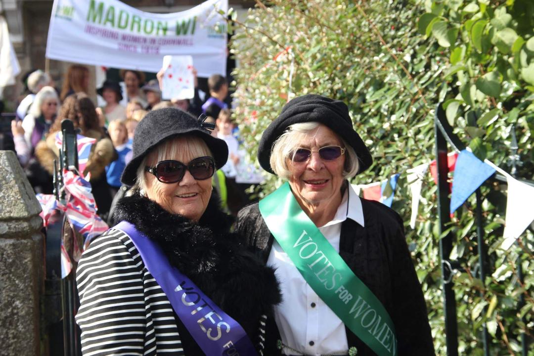 Two members of Crowlas and Ludgvan WI were invited to join Madron WI for their Suffragette March. The march celebrated combined Centenaries for both Madron WI and 100 Years since women were given the vote. Local schoolchildren and Mayor of Penzance Dick Cliffe joined in with the ladies, who were dressed in appropriate centenary outfits for the march which was followed by tea at the Landithy Hall in Madron.