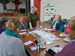 Folded paper card making with Jackie was just one of the delightful crafts on offer at our Four Corner Craft Day. Ladies came from a number of WI’s in the area to try their hand at something new. Lynne led a jewellery workshop using wire, beads and stones for an unusual effect, Val taught her group how to sew a pin cushiion in the shape of a bonnet and Charlotte showed how gingham and simple cross stitch are used for Chickem Scratch embroidery. With tasty soups and rolls and, of course, a delicious array of cakes it was the most enjoyable of days. Well done to Pat G for organising and to all those who helped.