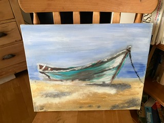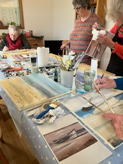 Crowlas and Ludgvan Artists ! A wonderful way to spend a very wet day is to rediscover your love of painting , and our group of 6 produced some very accomplished pictures of an abandoned boat on a beach . It was fun and challenging but everyone went home satisfied with the result . Well done to everyone .