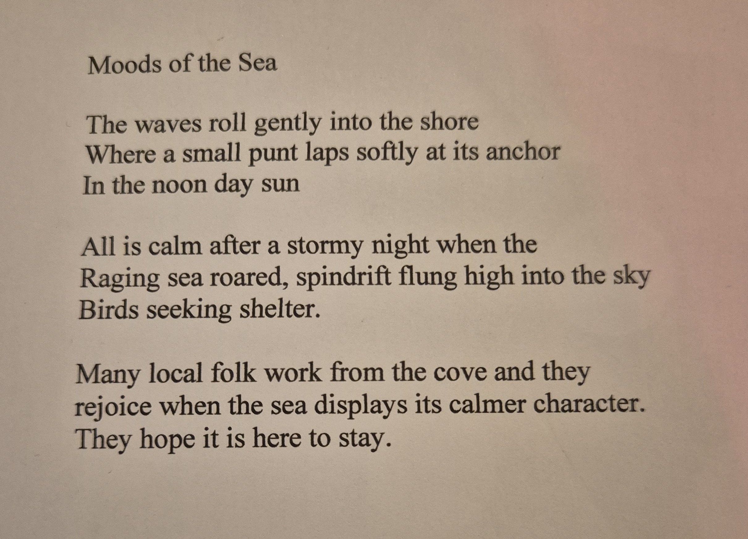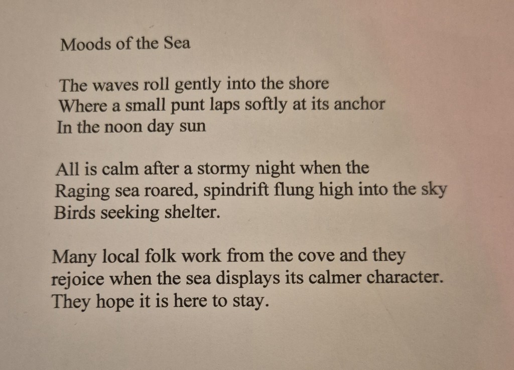 Ella Walsworth-Bell and Abi Ottley two local sea swimming poets were delightful speakers at our March Meeting. They enthralled our members with an array of poems from their books, some of them humourous, some enchantingly descriptive and some poignant. Pat G was the winner of the competition to write a poem with the verse below.