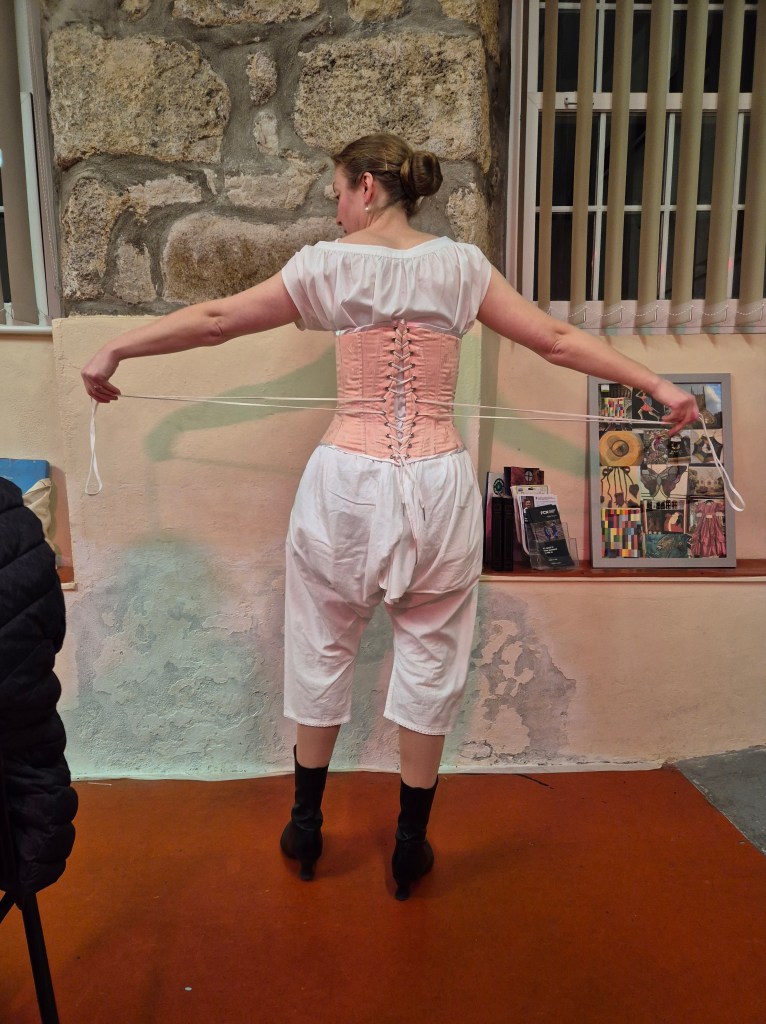 Emma, aka The Lady Time Traveller, paid a visit to the Murley Hall to instruct members on how to dress as a fashionable lady from the 1880s. From the voluminous cotton chemise, laced corset, layers of petticoats, and so on, to the elegant silk skirt and close fitted bodice, topped off with a stylish hat, the story of the ensemble came to life with Emma’s knowledgeable stories of the history of costume.